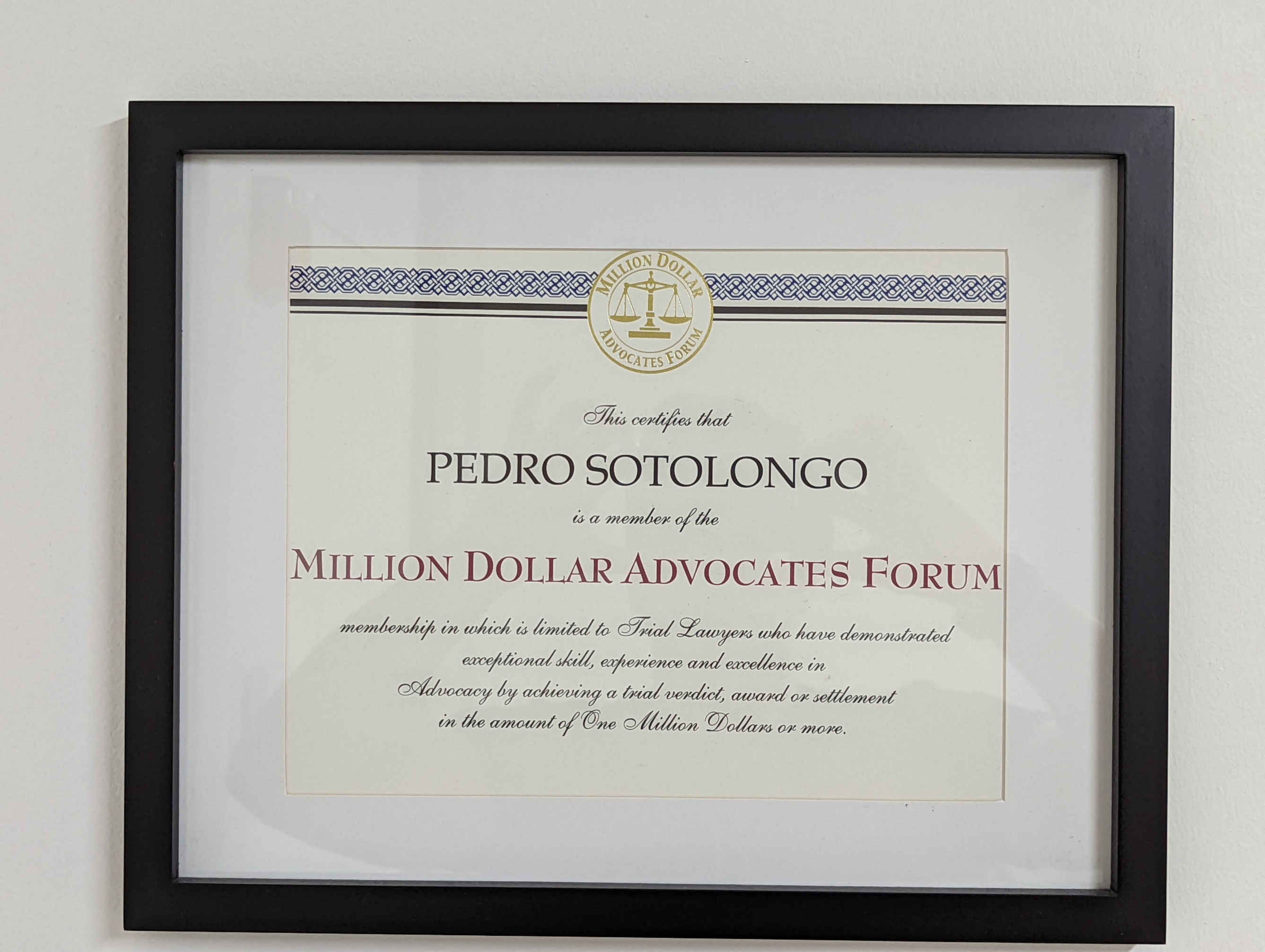 Pedro "Peter" Sotolongo is a member in good standing of The Million Dollar Advocates Forum, a membership recognizing trial lawyers who have achieved verdicts, awards, or settlements in the amount of $1,000,000 or more. He is also Ranked Top 100 Lawyers for his exceptional skills, achievements, and impact on society.